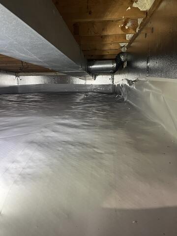 The waterproofing crew arrived to the customer's home and began by evening out the dirt floor. This made the crawl space leveled out in order to install the CleanSpace encapsulation system correctly. CleanSpace is a 20mil thick liner that encases the walls and floor of the crawl space. This 100% waterproof vapor barrier not only directs water to a sump pump, but also rejects mold growth. CleanSpace completely isolated this dirt crawl space from the rest of the house, which in turn, will improve air quality and decrease humidity levels. The homeowner was so happy to now have a drier, healthier crawl space!