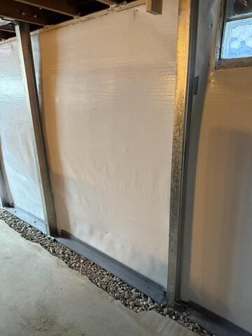 The project day arrived and the crew began by waterproofing the basement with the TripleSafe, WaterGuard and CleanSpace. TripleSafe is a three-pump system equipped with 1/2, 1/3 horsepower pumps as well as a battery backup. WaterGuard is a perforated subfloor drain that sits along the perimeter to catch and drain water into the sump pump. CleanSpace is a vapor barrier wall covering that not only combats mold, but directs moisture into the Waterguard. Finally, to fix the concerning buckling wall, the expert installers put in the PowerBrace system. These galvanized I-beams run the full height of the foundation wall and are securely fastened onto the floor joists. The PowerBrace holds the wall in place and can even be torqued over time to straighten it. This customer's worries were immediately subsided after installation and she could trust her home to keep her safe again.